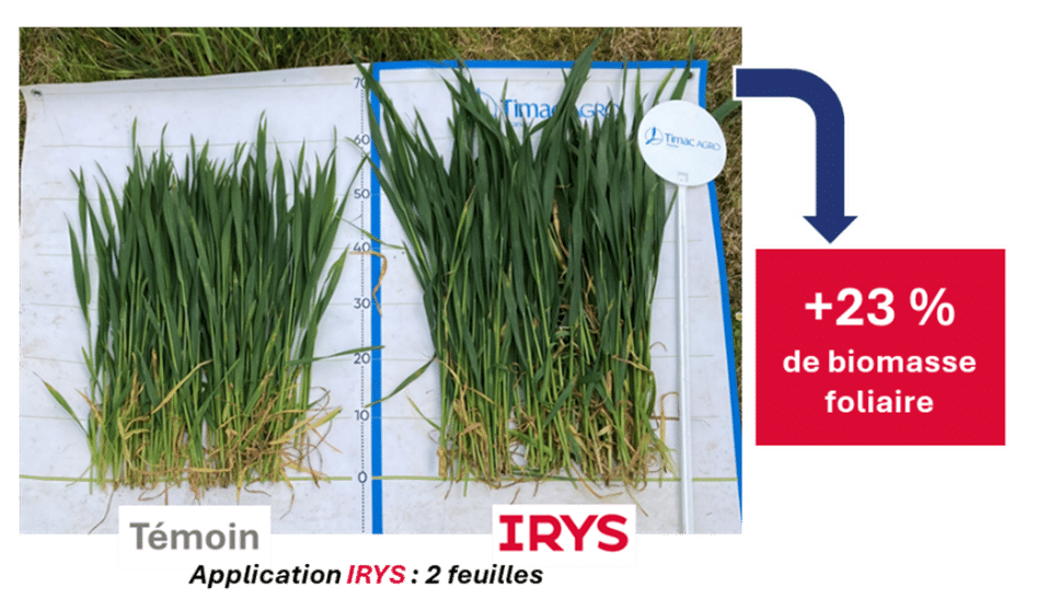 IRYS® est un biostimulant homologué (AMM n° 1190085) particulièrement bien adapté pour assister le début de cycle des cultures céréalières d’hiver et du colza. IRYS® active les gènes impliqués dans la croissance et l’activité racinaire : cela entraine une augmentation du nombre de pompes NPK au niveau racinaire pour une meilleure aptitude à valoriser les apports de fertilisants. Cet effet pompe est aussi stimulé par l’augmentation de l’expression des gènes impliqués dans la production d’ATP au sein de la plante, entrainant une meilleure libération de l’énergie au sein de cette dernière. L’utilisation d’IRYS sur céréales peut avoir lieu dès le stade 3 feuilles et jusqu’au tallage. Il s’effectue à la dose de 3 l/ha. Sur colza son positionnement se fait dès la reprise de végétation et jusqu’à boutons accolés.