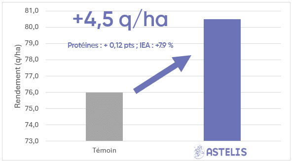 Dans notre synthèse pluri-annuelle, sur les 6 dernières campagnes, l’utilisation d’ASTELIS® à 2 l/ha durant le tallage, permet en moyenne un gain de 4.5 q/ha par rapport au témoin sans dilution de la protéine. Ceci démontre bien une meilleure valorisation de l’azote avec un indice d’efficience azotée supérieur de 7.9%.