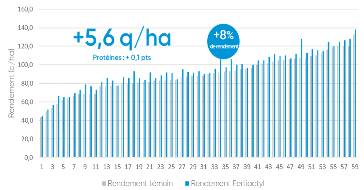 La synthèse pluriannuelle des essais conduits par Timac AGRO France sur FERTIACTYL STARTER® démontre une augmentation moyenne du rendement de +5.6 q/ha sur blé en relation avec une amélioration du Coefficient Apparent d’Utilisation (CAU) de l’azote apporté de 8%, montrant ainsi une meilleure efficience de la fertilisation azotée sur l’ensemble du cycle. Le retour sur investissement est positif dans 83% des situations analysées pour un blé à 200 €/t.