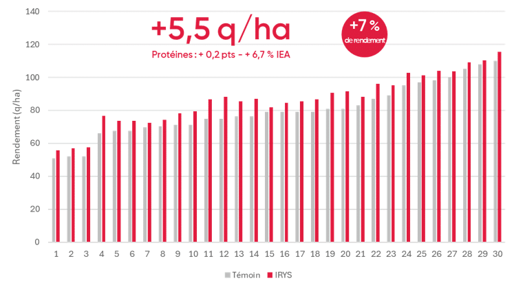 Dans nos suivis pluriannuels, l’application d’IRYS® sur blé tendre d’hiver permet en moyenne un gain de rendement de 5.5 q/ha sans dilution de la protéine. L’indice d’efficience azotée est amélioré de 6.7% avec IRYS®.
