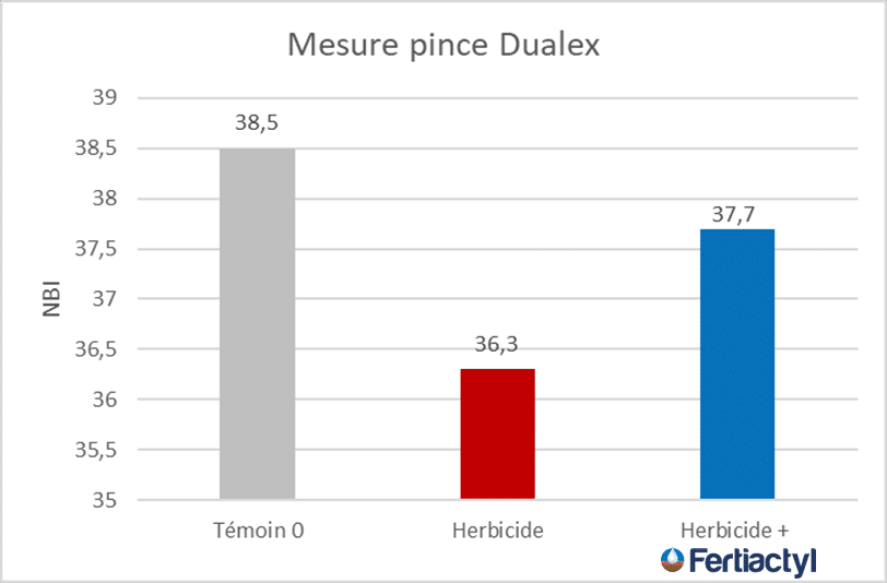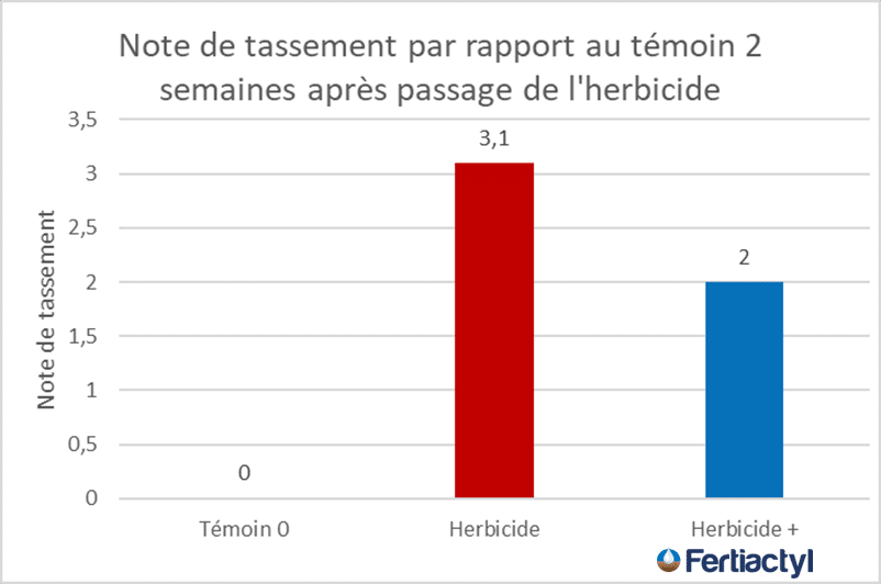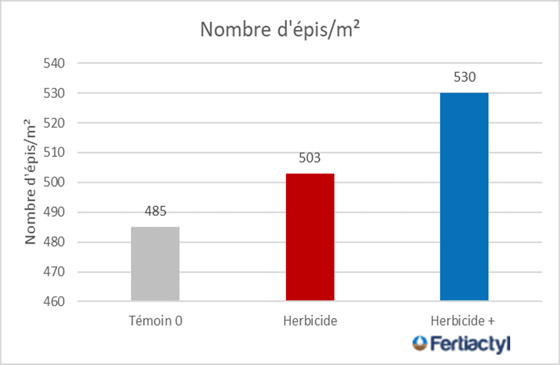 Des essais en association avec des herbicides ont également montré une réduction de l’effet potentiellement phytotoxique de certains herbicides utilisés en rattrapage en sortie d’hiver. L’utilisation de FERTIACTYL Starter® en association avec l’herbicide permet entre autres, de limiter le tassement provoqué par l’herbicide, de conserver une plante plus verte (mesure NBI avec pince Dualex) et d’augmenter le nombre d’épis/m².