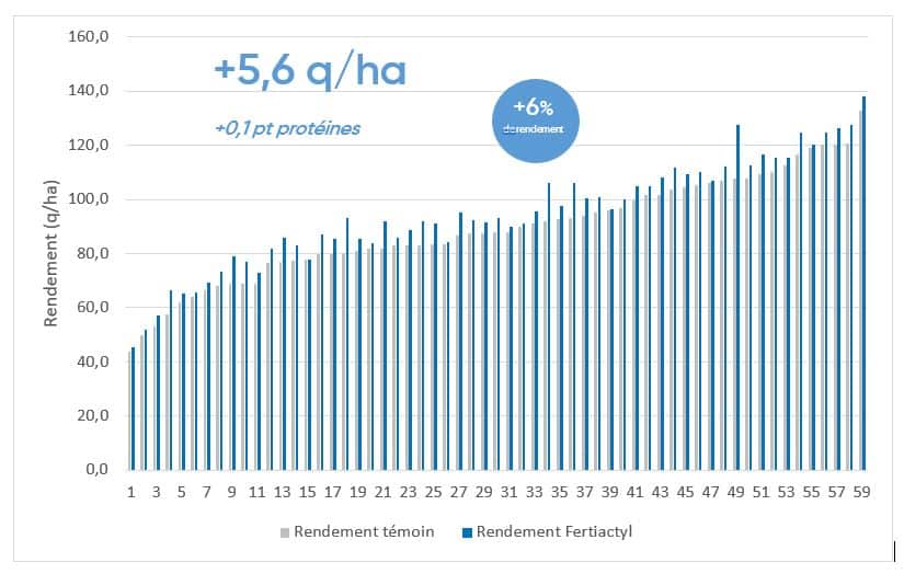 Synthèse pluriannuelle de 59 essais grandes bandes et micro-parcelles sur blé tendre d’hiver avec la solution FERTIACTYL Starter®.