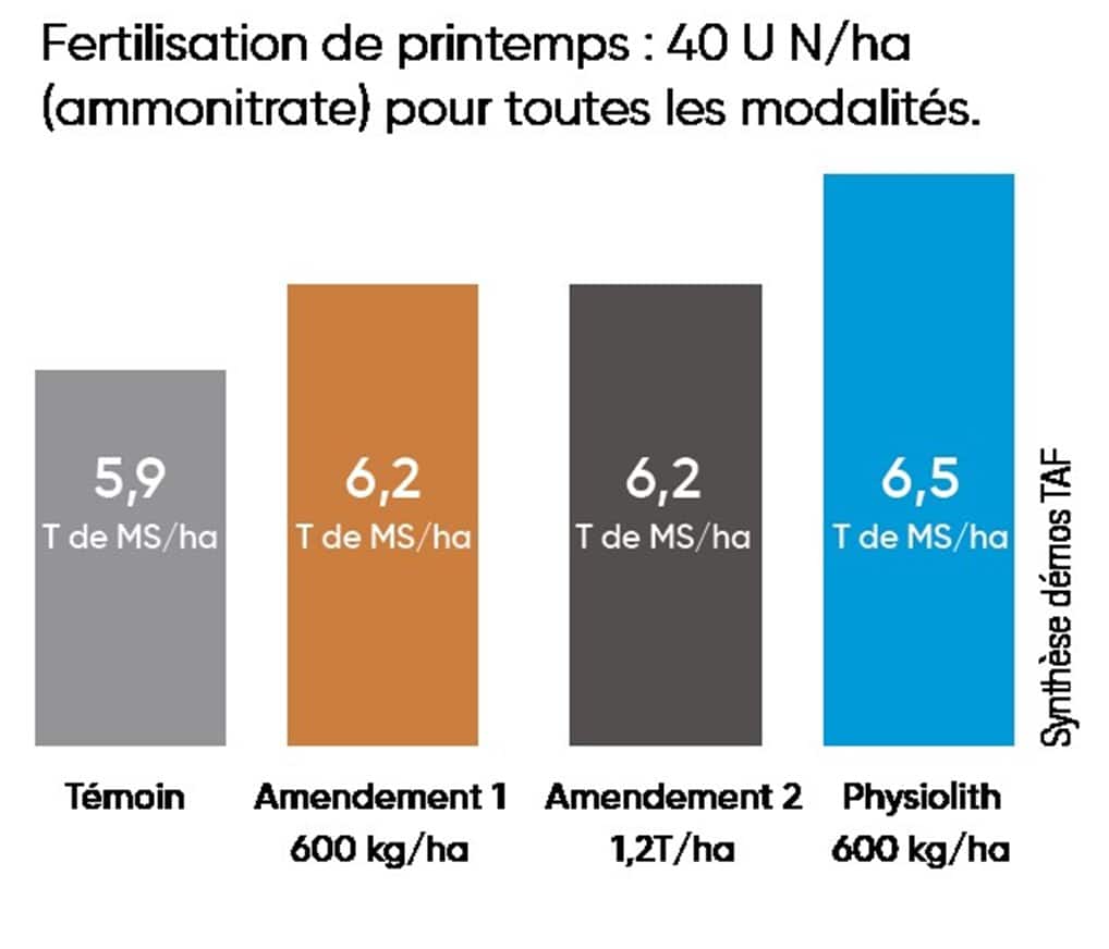 Dans nos suivis terrains, PHYSIOLITH® positionné en moyenne à 600 kg/ha sur prairies permet une augmentation de +0.3 TMS/ha comparé à un carbonate terrestre à 1.2t/ha ou une chaux vive à 600 kg/ha.