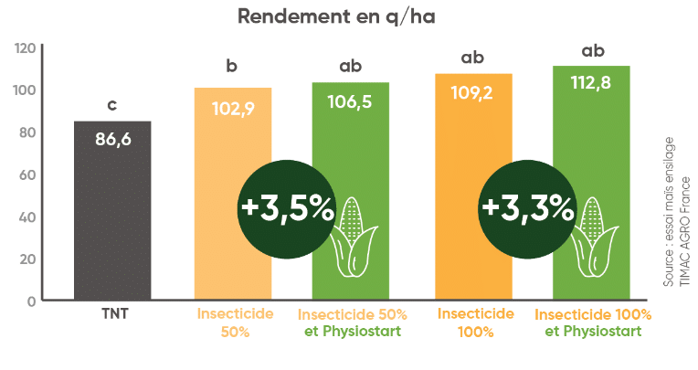 La réduction de dose insecticide a été démontrée dans le cadre d’essais, comme celui présenté ci-dessous. PHYSIOSTART® associé à un insecticide à 50% de la dose obtient un rendement non différent significativement de la pleine dose. En revanche, le gain de rendement vis-à-vis du témoin à 50% sans PHYSIOSTART® est de 3.5% et de 19% vis-à-vis du témoin non traité.
