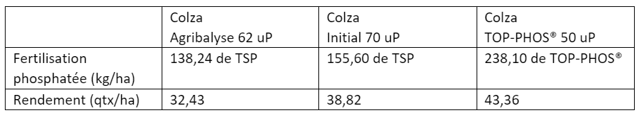 - Colza TOP-PHOS ®, avec une fertilisation phosphatée apportée par un TOP-PHOS® (50 uP)
