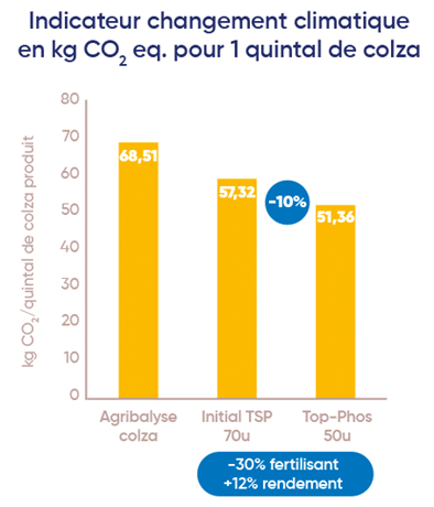 - De réduire de 10 % l’impact du colza sur le changement climatique par rapport à un scénario initial avec un apport de 70 unités de TSP 45 %