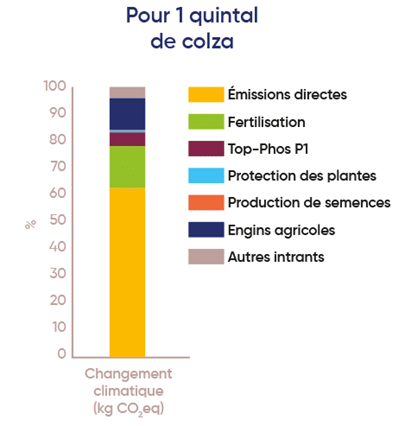 La plus grande part des émissions est liée aux émissions directes (liées aux émissions de CO2 et de N2O au champs). Le TOP-PHOS® représente 3,57 % de l’impact changement climatique avec 1,83 kg CO2eq / quintal de colza produit.