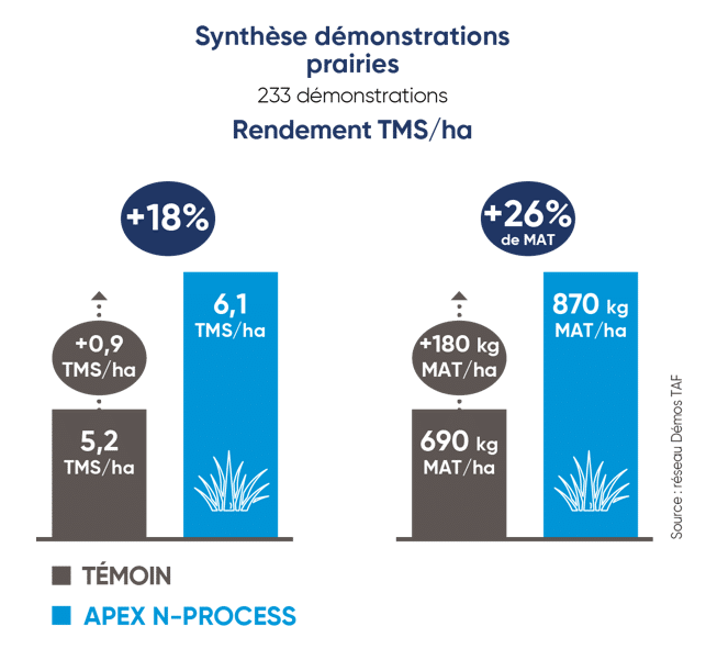 Sur prairies, l’apport d’APEX N-PPROCESS® permet non seulement de gagner en rendement mais surtout en qualité. Ainsi, en moyenne, sur la gamme d’engrais N-S, le gain de rendement moyen sur 233 suivis est de + 0.9 TMS/ha pour une dose moyenne d’APEX N-PROCESS® et du témoin de 55 unités/ha. De plus, les analyses de fourrages réalisées, illustrent un gain de 180 kg de MAT/ha. En favorisant l’autonomie protéique, la valorisation de toutes les sources d’azote avec en moyenne 30 unités d’azote absorbées et transformées en plus, APEX N PROCESS® participe à la décarbonation de la fertilisation azotée et l’amélioration du bilan carbone des exploitations d’élevage.
