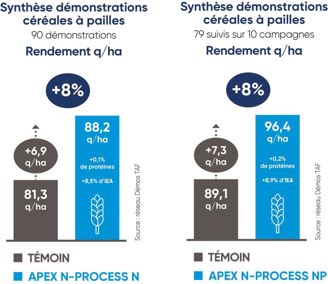 La meilleure efficience de l’azote engendre aussi une augmentation de la biomasse des plantes et notamment de la biomasse foliaire. Ceci se traduit in fine par une augmentation du rendement et de la qualité. Dans nos suivis d’essais, sur 90 suivis en céréales à pailles, nous observons en moyenne un gain de + 6.9 q/ha avec un apport d’APEX N-PROCESS® au 1er apport à isodose d’azote comparé au témoin. De plus, la qualité n’est pas impactée puisque le taux de protéines moyen est légèrement supérieur au témoin (+ 0.1 % de taux de protéines). L’efficience de l’azote minéral calculée via l’IEA (Indice d’Efficience Azotée*) montre un gain de + 8.5 % d’IEA avec l’itinéraire technique dont le 1er apport est sous forme d’APEX N-PROCESS® du fait d’un rendement supérieur et d’une non-dilution de la protéine.