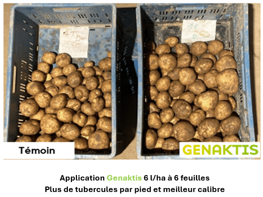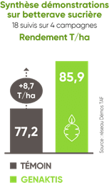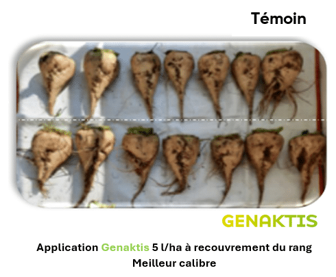 Les résultats sont aussi très bons sur cultures industrielles telles que la betterave et la pomme de terre. Ainsi, sur betterave sucrière, l’application de 5 l/ha de GENAKTIS® à la fermeture du rang permet en moyenne de gagner 8.7 t/ha de rendement (+13 %) sans perte de richesse.