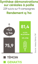 Sur maïs grain, l’application de GENAKTIS® au stade 6-8 feuilles à 3 l/ha montre un gain moyen de rendement de 7.6 q/ha (+8 %) avec un retour sur investissement positif dans 96 % des situations.