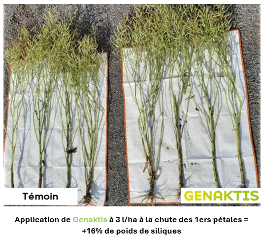 La seconde concerne les gènes de la régulation de la biosynthèse des phytolithes et notamment des gènes de l’absorption de silicium. GENAKTIS® permet une augmentation des pompes à silicium au niveau racinaire entraine une optimisation du port de la plante pour une meilleure interception de la lumière, une meilleure production de biomasse et une meilleure résistance aux stress (limitation des pertes d’eau par un meilleur fonctionnement des stomates).