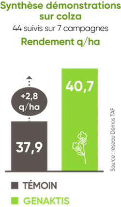 Sur colza d’hiver, GENAKTIS® positionné à 3 l/ha entre le stade début d’élongation de la tige et chute des premiers pétales, obtient un gain moyen de rendement de 2.8 q/ha (+8 %) et un retour sur investissement positif dans 93% des cas.