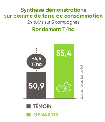Sur pomme de terre de consommation, nous observons dans nos suivis un gain moyen de 4.5 t/ha (+10% de rendement par rapport au témoin).