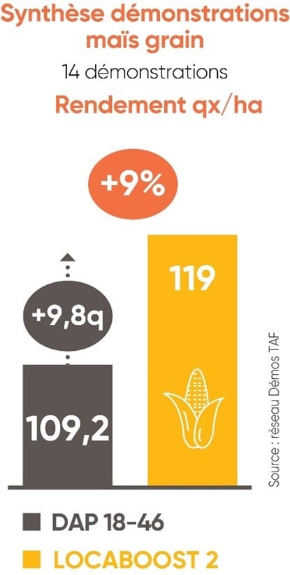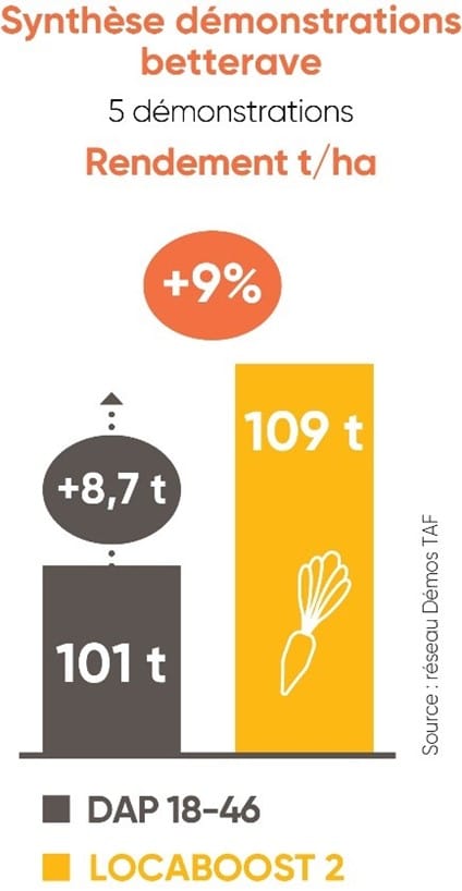 Dans nos suivis, un apport de LOCABOOST®2 en localisé, au semis à 150 kg/ha engendre une augmentation du rendement de 9 % sur les cultures de betterave sucrière et maïs grain comparé à un apport de DAP à 150 kg en localisé au semis.