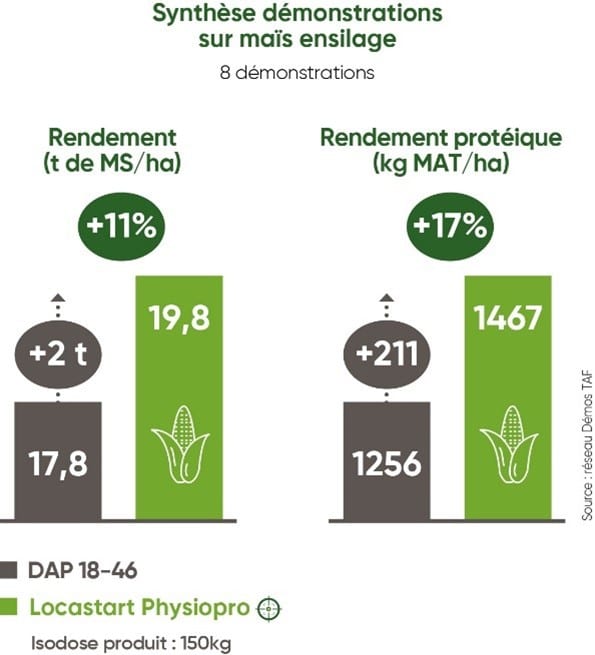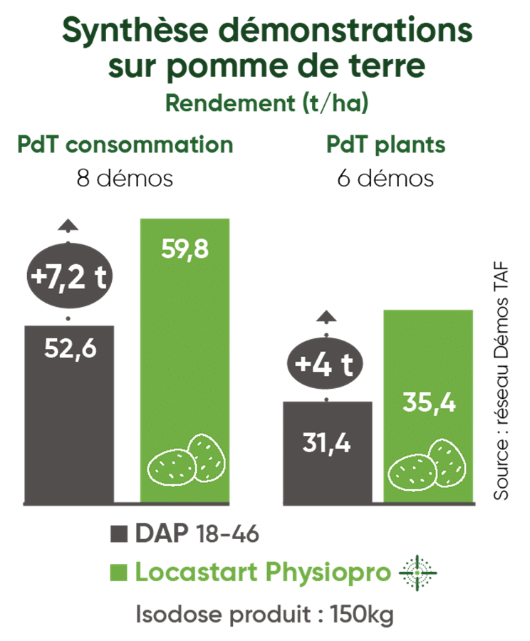 Les résultats obtenus dans nos démonstrations illustrent une augmentation significative du rendement avec LOCASTART® au semis comparé à un DAP 18-46 épandu en localisé à isodose de produit (150 kg/ha) avec +14 % de rendement sur pomme de terre et +11 % sur maïs.